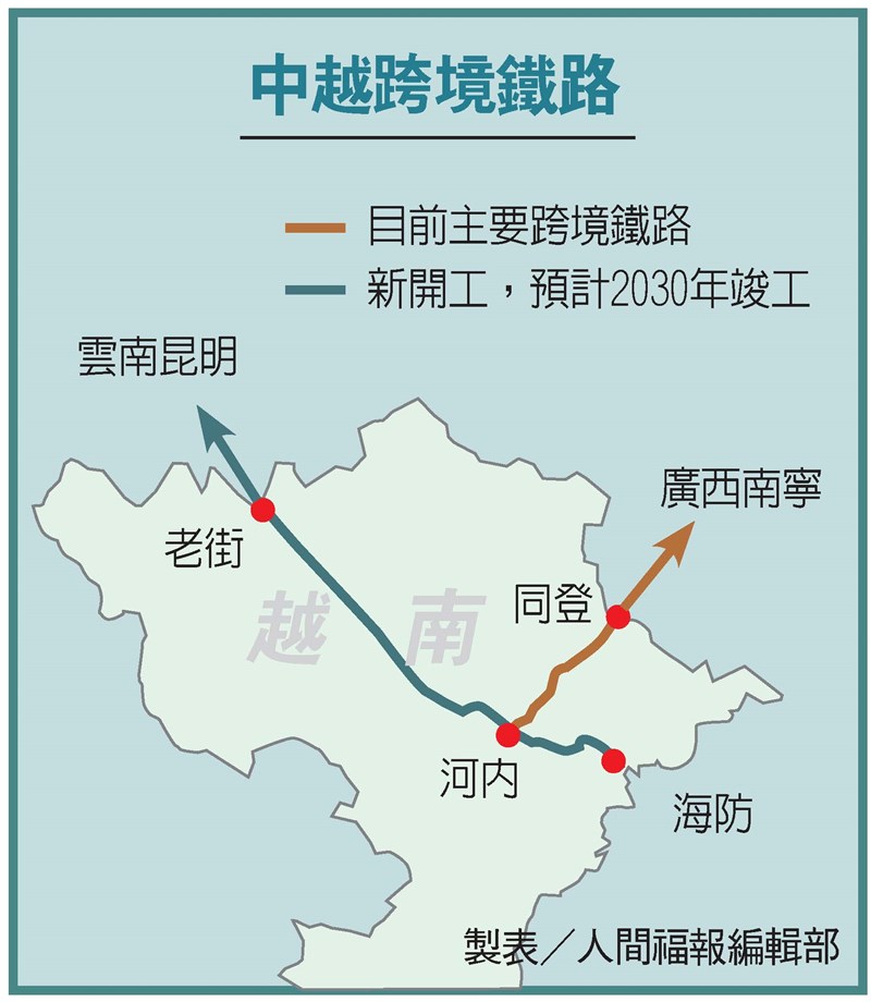 【本報綜合報導】越南19日在越南北部老街省舉行老街-河內-海防鐵路項目第一部分工程開工儀式,按規畫,這條鐵路的軌道設計將對標大陸鐵路,旨在打造中越跨境鐵路聯通,將連結起越南北部與大陸西南地區,並進一步接軌大陸「一帶一路」項目,目標在2030年完工。