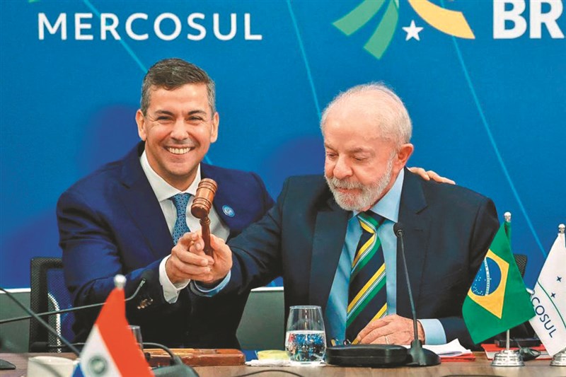 巴拉圭總統潘尼亞(左)和巴西總統魯拉(右)20日在巴西南部巴拉拿州伊瓜蘇瀑布的南方共同市場峰會共同手執議事槌,象徵巴西將輪值主席國一職移交給巴拉圭。圖/法新社