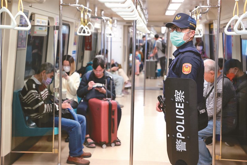 台北捷運系統接獲炸彈預告,捷運列車上有配戴盾牌的員警戒備。圖/葉信菉