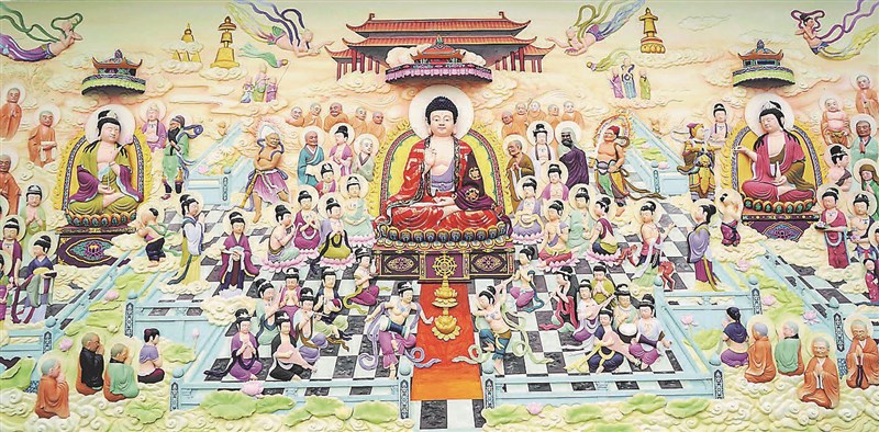佛光山藏經樓的「靈山勝會 佛光普照」經變圖浮雕照壁,描繪佛陀在人間時,為諸弟子宣說極樂世界的景象,諸天人及護法神祇亦共聚聽法。圖/人間社記者李明軒