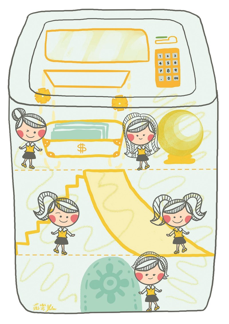 偌大的扇形講堂中央站著一位老教授,黑板上的粉筆字預告這節課將講解「自動櫃員機」,也就是俗稱的ATM。教授說每台自動櫃員機裡面會配備至少五位「櫃員精靈」,從機台後的插頭處打卡輪班,能二十四小時服務銀行用戶。基本的自動櫃員機分為三層樓,插入卡片並輸入密碼後,三樓的「晶球」會核對持卡人身分,資料正確時將供給齒輪傳動力。接著,櫃員精靈們會同時接收到晶球發出的電波,立即準備提款手續,分工合作將鈔票從一樓的金庫中取出,放入升降梯送上樓;存錢手續則相反,清點現鈔後下降入庫。如用戶需列印明細表,有專門的櫃員精靈負責謄寫細項,補充感熱紙及油墨也是這位精靈負責。二樓設有階梯和溜滑梯通道,能加快精靈們搬運紙鈔和銅板的速度。