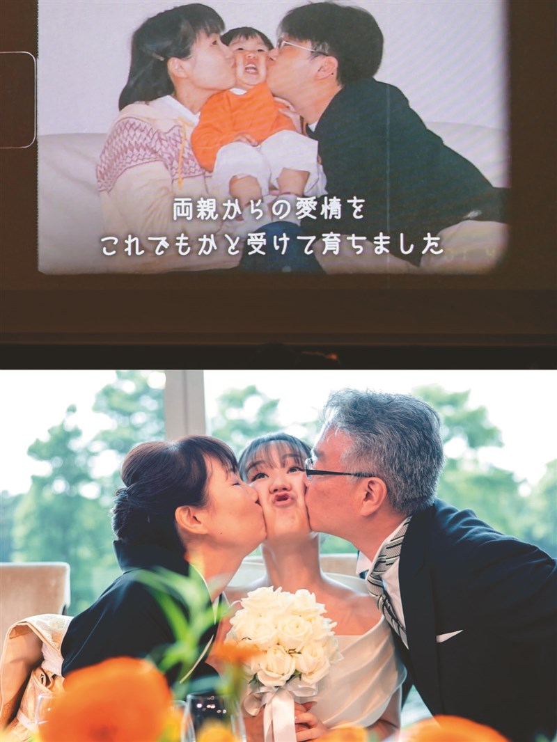 這張被瘋傳的超人氣照片出自社群平台IG名為「Syuuki」、從事婚攝的日本網友,他在貼文中透露,瀏覽新娘準備在婚禮上使用的資料時,他注意到新娘打算將一張兒時照片放入個人回顧影片,畫面中新娘被父母左右親吻臉頰,年幼的她則是露出無奈神情,影片還附上一段描述「從小就在父母滿滿的愛中長大」。