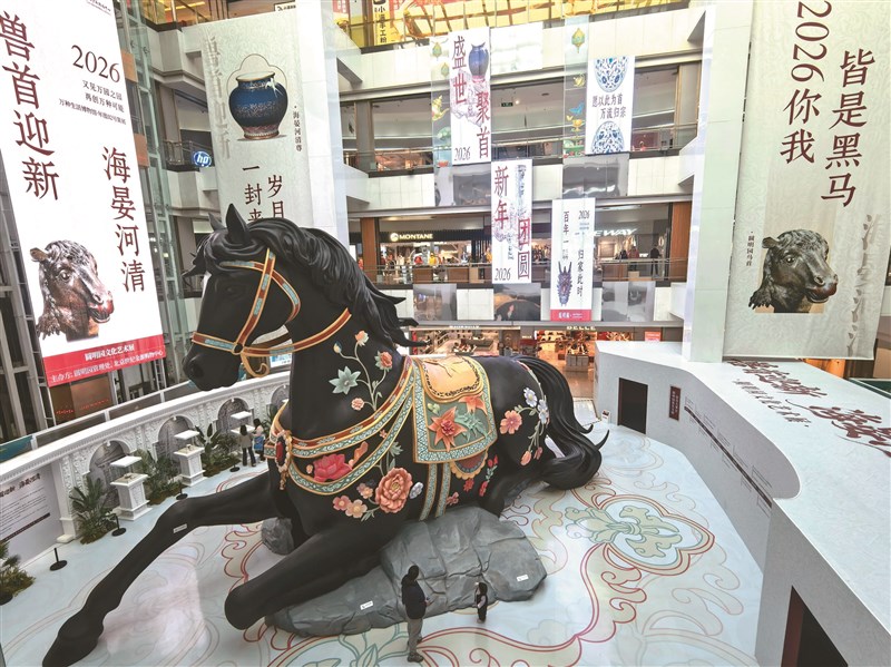 「獸首迎新 海晏河清—圓明園文化藝術展」,12月23日在北京世紀金源購物中心向公眾開放。展覽是圓明園首次將高品質文化藝術展,帶進城市核心商業空間,展覽匯集多組具有特殊意義文物的珍貴複製品;圖為民眾參觀長達16公尺的「巨馬」大型藝術裝置,其設計靈感源自圓明園館藏文物—馬首銅像,並融匯清代宮廷繪畫〈乾隆大閱圖〉的英武氣韻。圖/中新社