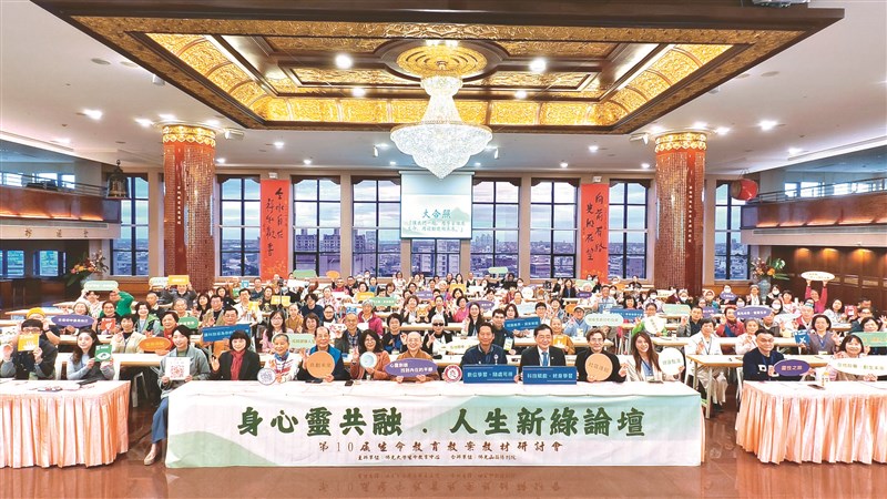 佛光大學第10屆生命教育教案教材研討會「身心靈共融.人生新綠論壇」,19日於佛光山蘭陽別院舉行,妙勤法師(前排右7)、張勝德(前排右6)、趙涵㨗(前排右5)蒞臨致詞。圖/人間社記者林君懿