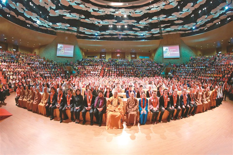 「2013兩岸神明聯誼會」於佛光山佛陀紀念館舉行,海內外近兩千尊神明、千家宮廟、百頂神轎、二百組陣頭齊聚,各宮廟代表在大覺堂與佛光山開山祖師星雲大師(中)及時任高雄市市長陳菊女士(大師左)等嘉賓合影。圖/人間社記者慧延