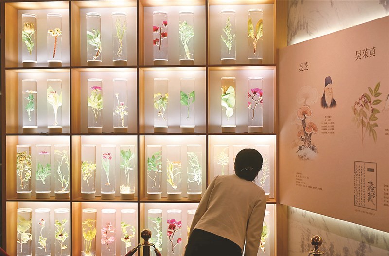 「華彩藥香──本草奧祕的哲思與藝術解碼」特展,昨起在中國大陸福州福建中醫藥大學開幕。本次展覽包含「本草擷芳‧自然形質之美」與「藥香凝萃‧人文智慧之美」2大區塊,透過圖文、實物、場景表演等形式,讓觀眾親近本草、感知中醫。圖為展出的本草標本吸引參觀者。 圖/中新社
