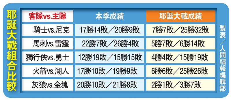NBA耶誕大戰 年輕2勢力強碰 張哲郢 |2025.12.26 語音朗讀 61觀看次 字級 大 中 小 此次比賽是詹皇第20次參加耶誕大戰。圖/法新社NBA耶誕大戰,以亞歷山大為首的年輕雷霆,對上溫班亞瑪(圖)等年輕勢力帶動的馬刺,最受矚目。圖/法新社馬刺(黑衣)本季雙殺雷霆(橘衣),儼然成為衛冕軍天敵。圖/法新社場上是全能中鋒的約柯奇,私下愛護動物,喜歡照顧馬匹,圖為他與愛馬。圖/取自網路19歲的佛拉格,即將迎接生涯首場耶誕大戰。圖/美聯社NBA耶誕大戰,以亞歷山大(圖)為首的年輕雷霆,對上溫班亞瑪等年輕勢力帶動的馬刺,最受矚目。圖/法新社耶誕大戰組合比較 製表/人間福報編輯部 文/記者張哲郢專題報導美國當地迎接耶誕節,代表NBA美國職籃年底盛會耶誕大戰登場,今年總計5場耶誕大戰,可以說頗有世代交替意味,對比人氣球隊洛杉磯湖人、金州勇士,新生代王者奧克拉荷馬雷霆以及崛起的聖安東尼奧馬刺,絕對是今年耶誕大戰最大亮點。今年耶誕大戰依序由克里夫蘭騎士出戰紐約尼克、馬刺作客雷霆、達拉斯獨行俠交手金州勇士、休士頓火箭對決洛杉磯湖人,以及壓軸明尼蘇達灰狼對陣丹佛金塊等5場比賽。從1946-47賽季NBA設立耶誕大戰以來,這天一直在北美職業運動占據重要部分,聯盟在安排賽程時,不單單只是用實力區分,還會考量話題效應,要盡可能端出前5個最扣人心弦的對戰組合。拿到上季總冠軍的雷霆,自然在耶誕大戰爭取到1個席位,但回頭看看這幾年,即便雷霆已經是常勝軍,上次被排在耶誕節出戰已經是2018年。這次雷霆重返耶誕大戰,也代表著NBA近期話題的改變,不再只是聚焦幾名老將帶領的球隊,新生代球星領軍的隊伍,逐漸攻占各大版面。5場賽事 雷霆戰馬刺最受矚以亞歷山大(Shai Gilgeous-Alexander)為首的年輕雷霆,無論進攻、防守、板凳深度甚至年齡,都在聯盟具有一定優勢,球隊一度在開季前25場打出平聯盟最佳24勝1敗。至今唯一能夠與雷霆匹敵的隊伍,非重獲新生的馬刺莫屬,這支上季勝率連5成都摸不到,排在西區倒數第3的爛隊,靠著溫班亞瑪(Victor Wembanyama)、卡索(Stephon Castle)等年輕勢力帶動,目前在西區高居第2,成績僅次於雷霆。讓這對耶誕大戰組合更具看點的是,雷霆本季僅有4敗,有一半正是馬刺所賞,馬刺目前對戰雷霆2連勝,且在耶誕大戰前夕,才剛讓衛冕軍吞下本季最慘敗仗,7連勝氣勢如虹,讓這雙強之爭未演先轟動。首次參加耶誕大戰的亞歷山大指出,這場比賽一定會很好玩,能在耶誕節出戰就像夢想成真般,以前都是在耶誕節看比賽,已經等不及要上陣,又對到非常強的隊伍。去年耶誕大戰繳出史詩級42分18籃板4助攻4阻攻的溫班亞瑪,認為雙方3天內兩度碰頭,雷霆一定會有所反彈,但他跟馬刺照樣會全力以赴。約柯奇愛動物 有顆謙遜的心■作為NBA美國職籃最全能長人代表,效力丹佛金塊的中鋒約柯奇(Nikola Jokic)不光是球技出色,私底下他更有著愛護動物的心,也因為這份熱誠,讓他即便繳出再誇張的數據,始終保持謙虛。約柯奇在耶誕大戰即將帶領金塊迎戰明尼蘇達灰狼,但過去他多次說過,耶誕節不是他的耶誕節,在這天出戰終究只是一場比賽而已。這不是約柯奇不在乎勝負,鮮少在球場上有激烈情緒反應的他,今年夏天被人捕捉到因為愛馬贏得比賽後感動落淚的畫面,讓人猜不透這位全能中鋒的心思。塞爾維亞有句俗語說『年少吞馬毛,你將無法自拔』,約柯奇曾表示,籃球只是他人生中的一部分,如同他所講,打籃球就像是工作般,他的興趣是在球場以外,從小接觸照顧馬匹的生活,讓自己有除了籃球以外的樂趣。每當回到家鄉,所有人對待他,就像當年在馬廄打雜的小弟般,他覺得,大家此時都不會把他當NBA球員看,他也因此養成謙虛。而約柯奇是出了名愛護動物,特別是馬,他形容這是遠離籃球的好方法,又能親近自然跟動物,他希望這份熱愛永遠不會消失。後浪鬥前浪 佛拉格力拚柯瑞 ■今年以選秀狀元身分為NBA美國職籃投入新生代希望、達拉斯獨行俠菜鳥佛拉格(Cooper Flagg)即將迎接生涯首場耶誕大戰,他將面對曾經是聯盟看板球星柯瑞(Stephen Curry)領軍的金州勇士,他的出戰也將寫下史上參加耶誕大戰第4年輕紀錄。剛滿19歲不久的佛拉格,經過開季前幾場低迷表現被球迷形容「過譽」後,逐漸在聯盟找到生存之道,在他生涯前20場比賽,場均16.7分6.6籃板3.5助攻並不算太驚人,進入12月後他狀態加溫,過去10場平均來到24.1分6.2籃板4.5助攻,且在耶誕大戰前一場比賽,更繳出33分9籃板9助攻準大三元成績。這位打破聯盟史上最年輕單場40分的新星,儼然已是獨行俠重返西區勁旅的最大本錢,縱使目前獨行俠戰績連5成都不到,還是被排在耶誕大戰名單中,可見聯盟對這位狀元郎的期待有多高。佛拉格透露,從小他是每年必定收看耶誕大戰的忠實觀眾,如今能有機會參與,他感到非常榮幸,他在耶誕節許下的願望,便是多幫獨行俠贏幾場球。佛拉格較勁的對手頗有NBA前後看板傳承意味,曾是聯盟第1人的柯瑞,所屬勇士已經連13季參加耶誕大戰,柯瑞也直言很興奮能夠在耶誕大戰跟新生代球星交手,特別這是勇士戰績重新回到超過5成的機會,會有更多動力。老將詹皇 更希望陪家人過節■NBA美國職籃洛杉磯湖人加上今年已經連27季參與耶誕大戰,是當季連續參加次數最多隊伍,陣中將滿41歲的老將詹姆斯(LeBron James)更會是生涯第20度參與耶誕大戰,然而隨著他長期在聯盟打滾,他
