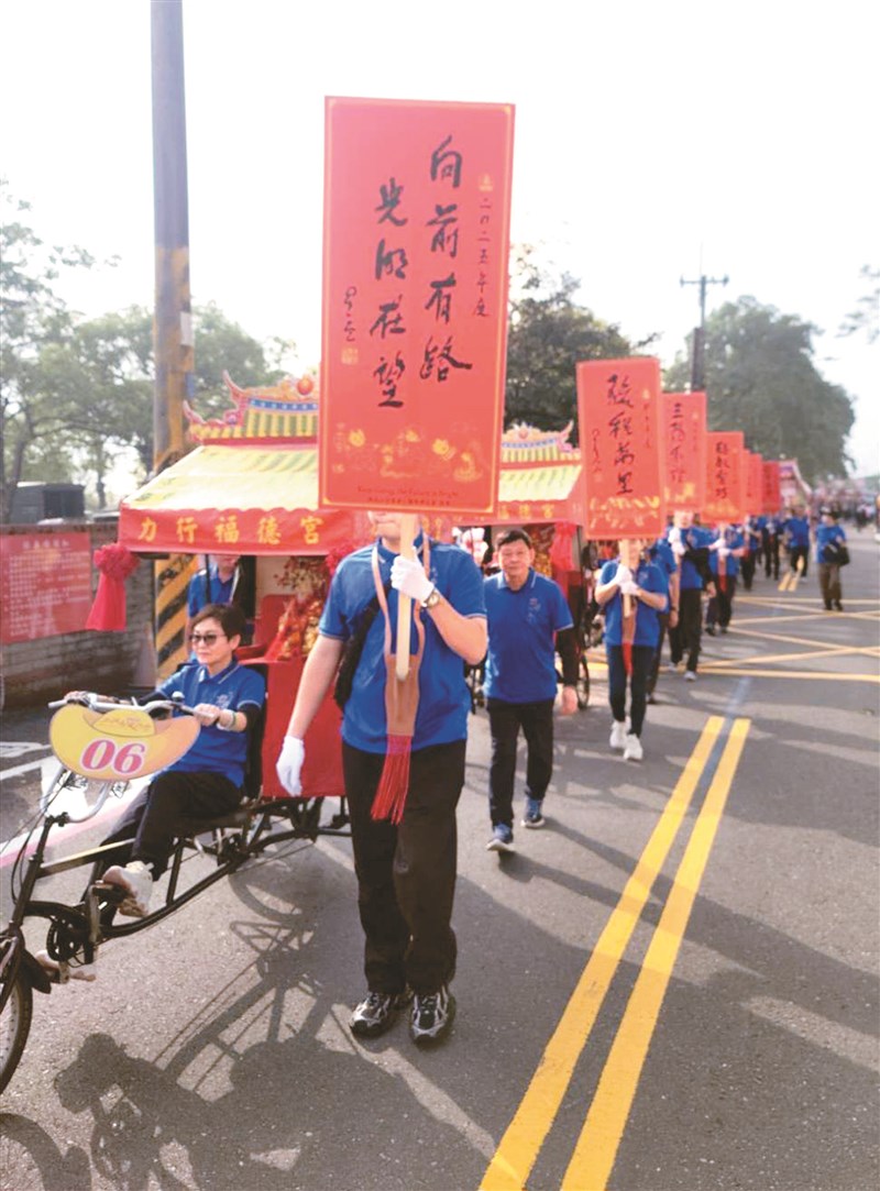 第12度參與世界神明聯誼會的新北市中和區力行福德宮,進場隊伍由主任委員林寬仁率領,以佛光山開山祖師星雲大師提倡的世界和平、宗教和諧理念策畫,高舉12座星雲大師法語,引領包含20名親善大使,共120名信眾搭配11輛行動版土地公三輪車組成進場隊伍,莊嚴而活潑,成為全場矚目焦點。圖/力行福德宮提供
