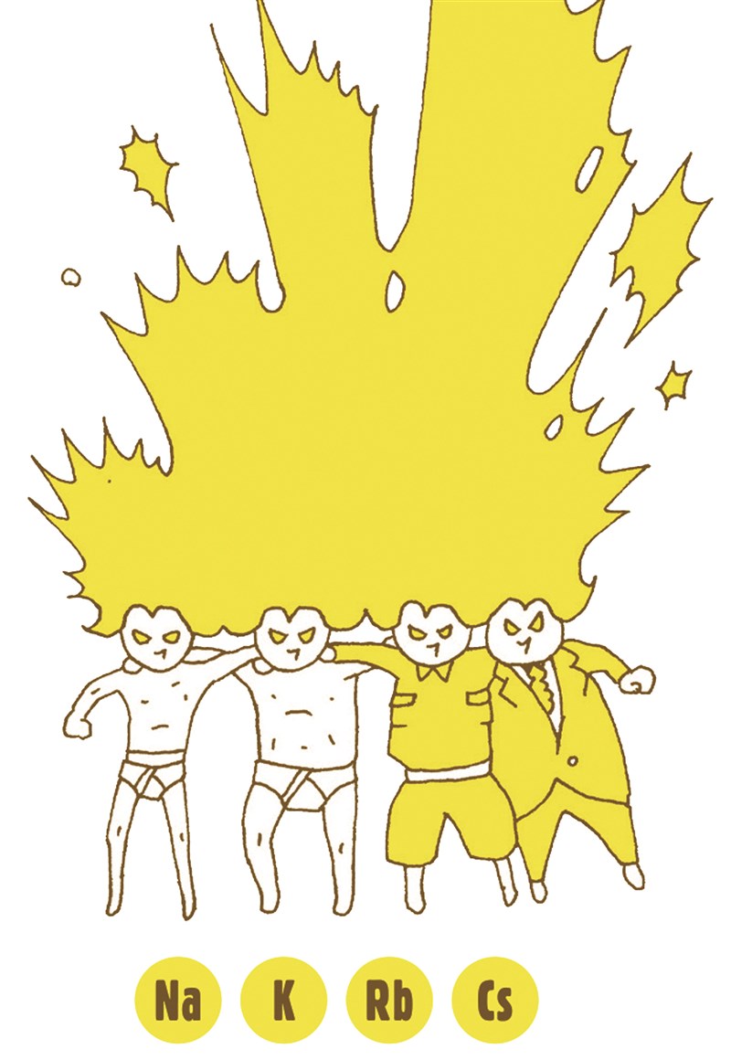 看似和平文靜的納、鉀、銣、銫,只要單獨進入水中,就會大變身,與水發生激烈反應產生大爆炸。也因此它們平時都是被保存在石油裡。破壞力排行榜從最弱到最強,依序是鈉—鉀--銣--銫。