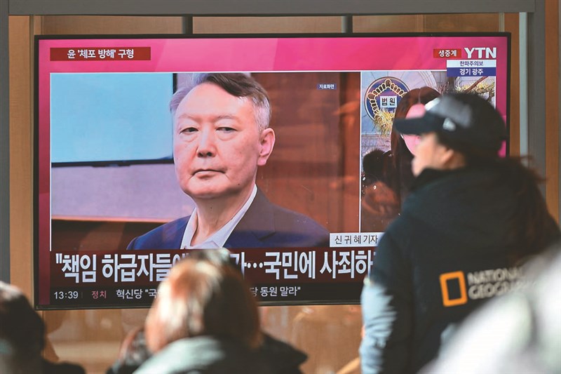 南韓前總統尹錫悅因涉嫌妨害公務等罪名,26日被檢方求刑10年。首爾車站內的電視當天直播他出庭。圖/美聯社