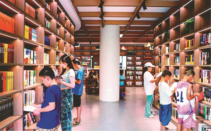 少兒閱讀區裡,義工正帶領孩子們走進安徒生的童話世界。「我們社區經常在這裡舉辦讀書活動,目前的計畫是一年二十多場。」社區工作人員介紹,抱石書房多由社區閒置空間改造而成,配備自助借還書機等智能化設備,通過「政府建設+書店供書」的公益合作模式,確保圖書常換常新。
