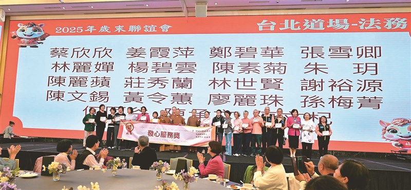 聯誼活動由台北道場、大慈佛社、松山寺及內湖禪淨中心共同頒發「發心服務獎」,表揚近兩百名長期投入服務的義工,肯定其持續奉獻的菩薩行。
