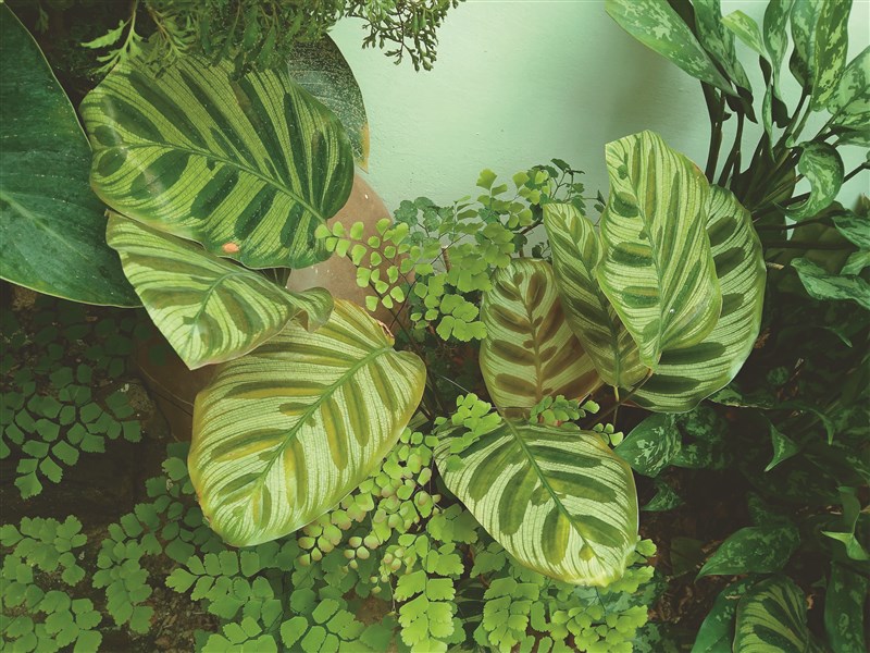 這株孔雀竹芋原先種在甕型花器裡,安置在客廳窗邊的矮櫃上,既淨化空氣,也點綴空間。晨光灑落時,葉片透出淡淡的淺綠光澤,彷彿半透明;葉面有羽毛狀墨綠紋路,葉背則是紫紅色,是標準的觀葉型室內盆栽。