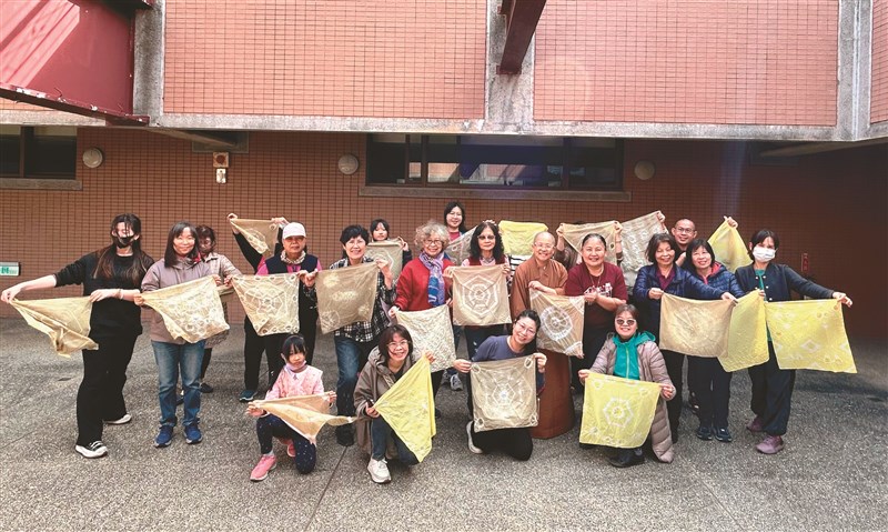 活動後段進入染液製作與操作。福木枝葉剪碎後熬煮,透過加熱萃取出染液,再依步驟加入媒染劑,觀察色澤的變化。學員輪流將綑綁完成的棉布放入染鍋中浸染、翻動,隨著植物色彩逐漸滲入布料,作品也慢慢成形。主任如輝法師提醒大家,在染布過程中靜心觀照,將祈願與祝福寄託於作品之中。學員在創作中透過心念轉換獲得安定與喜悅。