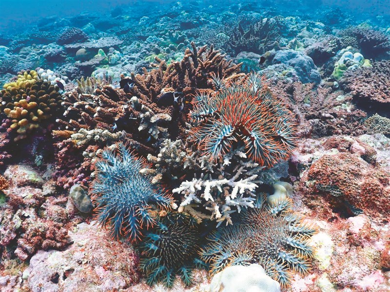 監察院報告指出,位於東沙環礁國家公園的棘冠海星大爆發,造成石珊瑚嚴重破壞。圖/鄭明修研究員團隊提供