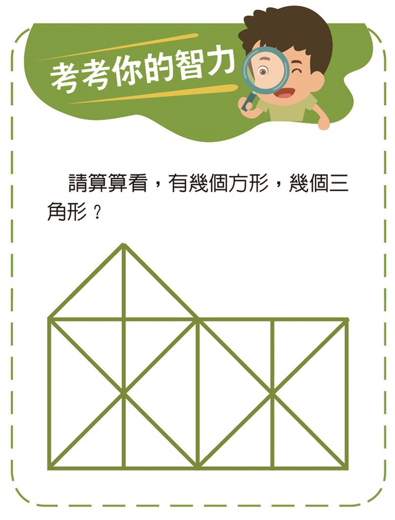 【考考你的智力】 |2025.12.29 語音朗讀 39觀看次 字級 大 中 小 請算算看,有幾個方形,幾個三角形? 請算算看,有幾個方形,幾個三角形?解答:三角形:41個方形:13個 前一篇文章 增加步行 保障健康 下一篇文章 熱門新聞 01銀杏點亮.東京印象2025.12.2302【獻給動物朋友的詩】 最可愛的動物詩路2025.12.2503北捷英雄捨身救人 母盼菩薩接引2025.12.2304【守護家人】 為愛築家2025.12.2305以法相聚 佛光山員義工歲末聯誼2025.12.2406台北道場歲末聯誼 感謝義工同行菩薩道2025.12.2707社論--悲憐天下父母心2025.12.2508【寰宇采風】京都最溫柔的秋色:紅葉永觀堂2025.12.2609奧斯汀佛光人 感謝警消守護2025.12.2410南天寺英文佛學營 佛青培養內在力量2025.12.24 訂閱電子報 台北市 天氣預報 台灣一週天氣預報 相關報導 增加步行 保障健康走每一步 計步器 都知道同類元素週期表 夢中現身認識雙關語無L字母日
