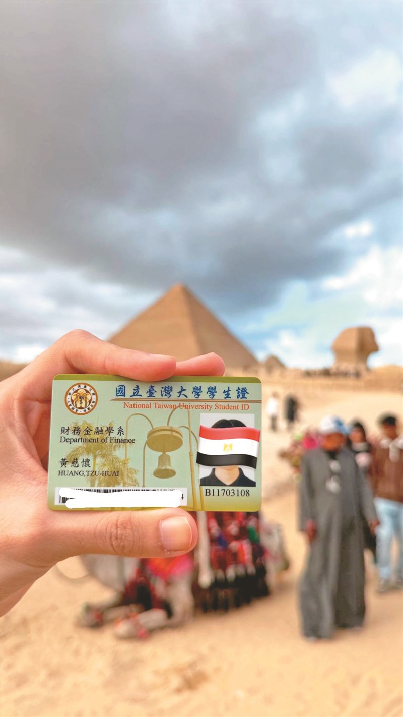網友「therealjacobchen」在Threads發文表示,他在埃及人面獅身像附近,撿到一張台灣大學財金系黃姓學生的學生證,他張貼學生證與金字塔、人面獅身像的合影,試圖尋找這位丟失學生證的學生,並表明能幫他把學生證帶回台灣。