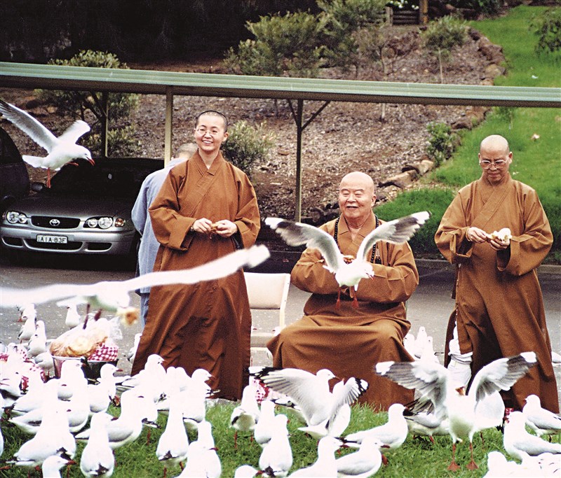 星雲大師昔日到澳洲弘法,於佛光山南天寺餵海鷗。圖/佛光山提供