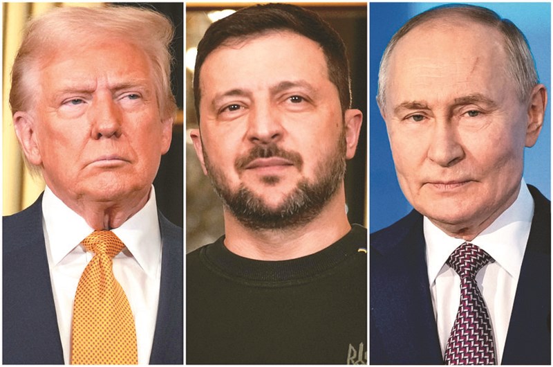 俄羅斯29日指控烏克蘭發動無人機攻擊總統普亭(右)官邸,烏克蘭總統澤倫斯基(中)嚴正否認;美國總統川普(左)稱對此非常火大。圖/美聯社