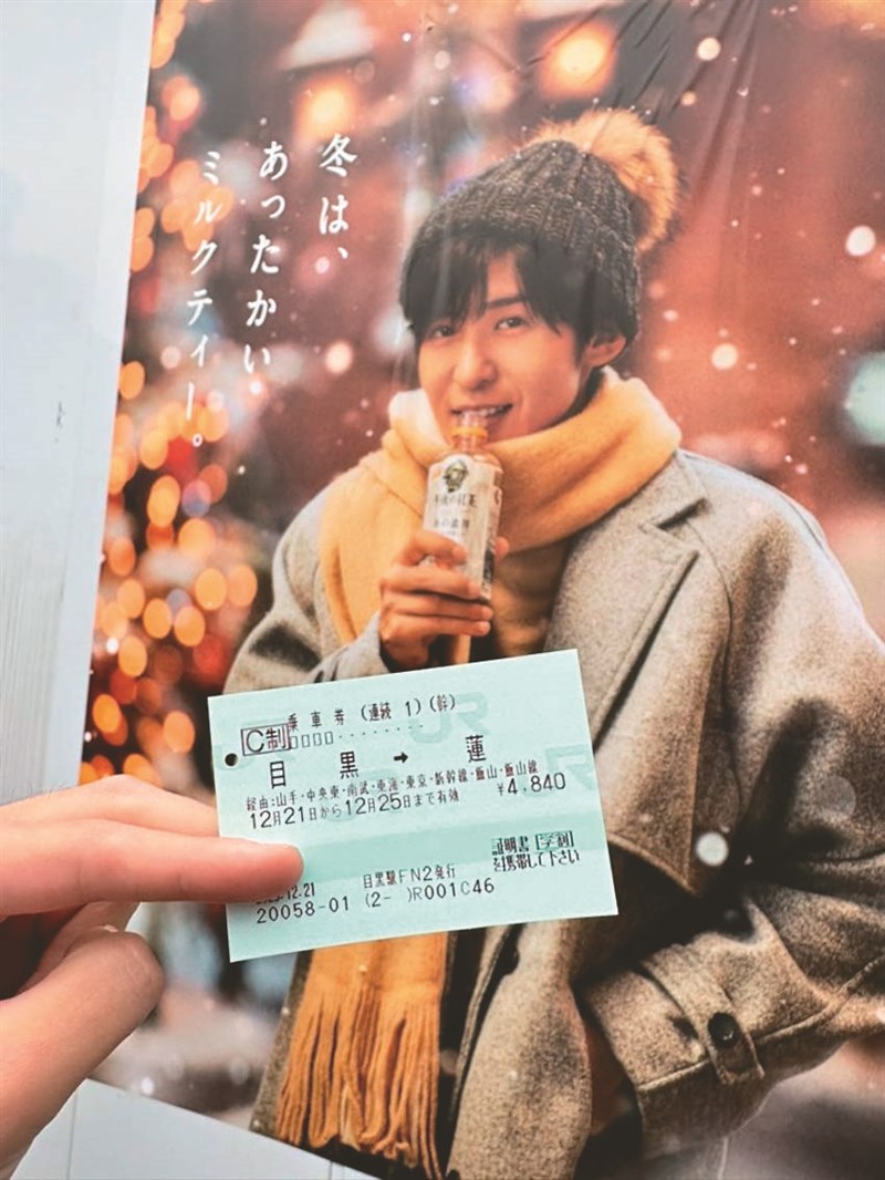 【本報綜合外電報導】台灣許多人會購買「追分」到「成功」的車票來祈求考試高分、追分成功。日前有位日本網友購買從東京都「目黑站」到長野縣「蓮站」的車票,並且在人氣J-POP團體Snow Man成員目黑蓮代言的午後紅茶廣告前拍照,網友大讚「天才」。