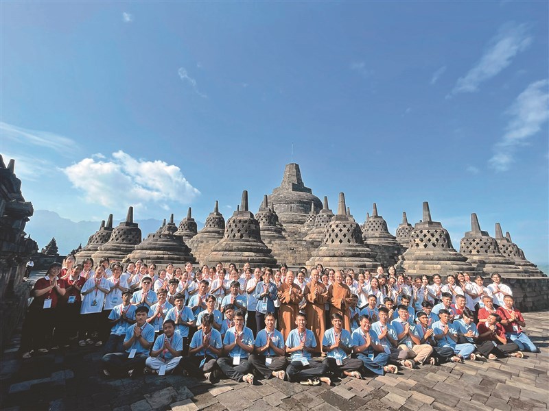 佛光山印尼佛教學院12月19至21日在印尼中爪哇舉辦「2025年雲水禪心佛學營」,其中一天學員們在世界文化遺產婆羅浮屠進行三步一拜的朝山修持,完成後全體參與者合影。圖/佛光山印尼佛教學院提供
