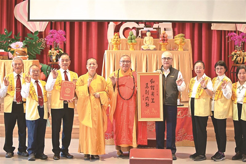佛光山慈善院副院長妙璋法師(左4)、佛光山雲林講堂住持慧得法師(左5)致贈2026年大師新春墨寶「和諧共生 馬到成功」予法務部雲林第二監獄典獄長林豐材(右4)。圖/人間社記者趙象觀