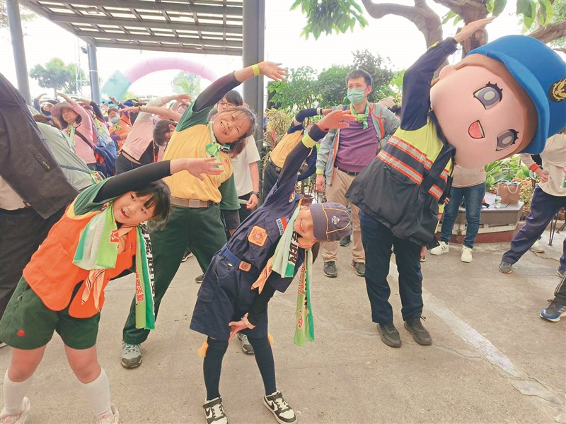 參加超慢跑的民眾與可愛的警察大頭娃娃一起做暖身操。圖/人間社記者如浩