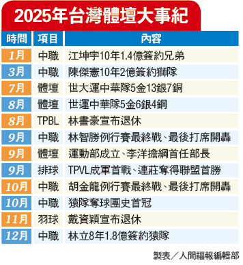 2025台灣體壇回顧 告別與新生 張哲郢 |2026.01.02 語音朗讀 46觀看次 字級 大 中 小 戴資穎(圖)、胡金龍、林智勝與林書豪,皆在2025年宣布退役。圖/余承翰戴資穎、胡金龍、林智勝與林書豪(圖),皆在2025年宣布退役。圖/資料照片戴資穎、胡金龍、林智勝(圖)與林書豪,皆在2025年宣布退役。圖/味全龍隊提供 TPVL台灣職業排球聯盟耗時約2年時間順利成軍,右起隊伍為台中連莊、桃園雲豹飛將、台鋼天鷹、台北伊斯特。 圖/取自TPVL臉書湯智鈞去年在世大運射下男子反曲弓個人賽金牌。圖/大專體總提供2025年台灣體壇大事紀 製表/人間福報編輯部樂天桃猿擊敗中信兄弟拿下中職總冠軍,現場落下酒紅色封王彩帶,球員開心慶祝。圖/中央社戴資穎、胡金龍(圖)、林智勝與林書豪,皆在2025年宣布退役。圖/余承翰 文/記者張哲郢專題報導告別2025年,過去這一年台灣體壇有不少家喻戶曉的球星選擇離開賽場,每名球星引退都讓球迷感到萬分不捨;同時2025年台灣體壇也有不少空前創舉,本周運動曼陀羅也將回顧2025年這帶有些許感傷以及嶄新曙光的國內體壇。多位球星引退 球迷萬分不捨國內受歡迎如棒球、籃球以及羽球都有球星華麗轉身,中華職棒全壘打王林智勝、打擊機器胡金龍相繼引退,象徵一個世代的落幕。感染無數台灣人對籃球熱情的「林來瘋」林書豪,幫助新北國王奪得首季TPBL冠軍後,選擇急流引退,並在年底返台參加自己的球衣背號退休儀式;帶起台灣羽球風潮的羽球天后戴資穎,同樣在去年正式宣布高掛球鞋,台灣羽球正式邁向「後戴資穎時代」。世大運世運會 都傳來好消息雖然有感傷時刻,在2025年國內體壇也有不少振奮人心的好消息,繼職棒、職籃後,TPVL台灣職業排球聯盟成立,台灣排球踏進新紀元;在德國萊茵魯爾世界大學運動會以及世界運動會上都有不少選手繳出好表現,對於今年要挑戰名古屋亞運的選手,提早有了國際大賽經驗。而最重要莫過於運動部正式成立,告別過去教育部體育署,成為行政院下最新成立的部門,部長更是邀請2屆奧運金牌得主李洋出任,在接下來的日子,期望可以帶領台灣體育更上層樓。戴資穎揮別羽壇 傳奇落幕說起退休,不得不提到在過去10年帶給台灣羽球重大影響的羽球名將戴資穎,由於膝傷的關係,她在11月正式宣布退役,她的退休不只是讓台灣球迷萬分不捨,就連世界羽壇都感嘆,這就像一個世代的終結。小戴在場上不放棄的拚戰精神,場下如小女生般的可愛反差,還有她那令人歎為觀止的手法,都是她圈粉世界的原因之一,她留下如球后在位周數、冠軍次數、連勝等傲人紀錄,都讓她璀璨的羽球生涯更加精采。如同球迷常說的「無可取戴」,小戴在歷史上的地位有著不可取代的價值,她也向大家喊話,希望小戴的精神可以陪伴大家繼續前進。中職林智勝、胡金龍 宣布退役中華職棒在2025年又告別2位偉大球星,歷史全壘打王林智勝決定在奮戰職棒22年後退役,曾經上過大聯盟的胡金龍同樣宣布引退,更不可思議的是,這2名球員都在例行賽生涯最後打席開轟,堪稱中職去年最難忘畫面之一。林智勝生涯出賽1719場,留下打擊率3成08、305轟成績,不只是中職首位達標300轟的球員,放眼未來,短期內甚至不會有人能夠威脅他的全壘打障礙。胡金龍2007年升上大聯盟後,首安便是全壘打,返台後他展現恐怖的打擊能力,生涯打擊率高達3成44史上之最。9月7日林智勝引退系列賽生涯最後打席,他在大巨蛋開轟,讓全場陷入沸騰,更顯示他作為球星的魅力;同樣場面10月6日再次上演,胡金龍例行賽生涯最後打席開轟加入林智勝行列,為2人輝煌生涯再添經典。林書豪退休 7號球衣高掛球場6月帶領TPBL新北國王完成隊史2連霸後,台裔美籍球星林書豪在暑假無預警宣布退休,這位曾在NBA掀起「林來瘋」的籃壇巨星,所留下是他帶給無數亞洲人對於籃球的希望。林書豪選擇在台灣對外闡述自己的心路歷程,他在台灣打球找到久違的開心,並在生涯尾聲完成與林書緯一起打球的心願,生涯已經圓滿。日前林書豪重返國王主場,也和天王周杰倫世紀合體,雖然這位球星從小在美國長大,身上卻留著不折不扣的台灣血液,他也選擇在自己父母的家鄉,最後一次站上球場,並接受球隊將他極具意義的7號球衣退休。成都世運 女子拔河6連霸中華代表團在2025年成都世界運動會寫下隊史新猷,在女子拔河完成史無前例的6連霸壯舉後,賽會最後2天猛拿4金,以5金6銀4銅締造境外參賽最佳紀錄。女子拔河向來是中華代表團必爭金牌,世運女將們克服惡劣天氣,成功把連霸推進至6連霸,還在年底獲選體育運動精英獎最佳團隊獎;來到賽會尾聲,亞運金牌女將劉巧兮再次爭光,在自由式輪滑女子速度過樁封后。而唯一帶回2金的健力項目,江凱傑、楊森這2位名將相繼封王,團體項目合球靠著黃英庭再見絕殺氣走大魔王荷蘭,抱回史上第1面世運合球金牌。史上最驚奇劇碼 猿隊逆襲摘冠對中華職棒樂天桃猿球迷來說,去年如坐雲霄飛車,先是季中球隊兩度爆出內部風波,但球員們沒放棄,選擇凝聚彼此,最後在季後賽首輪演出首次下克上晉級,並在最後奪得總冠軍的驚奇劇本。中職自2022年調整季後賽制度保證至少3隊能參加後,從來沒有第3種子球隊能從挑戰賽勝出後奪冠,猿隊成為首支在挑戰賽「讓2追3」晉級的隊伍。延續挑戰賽氣勢,猿隊在總冠軍賽以4勝1敗扳倒聯盟戰績第1的中信兄弟,抱走自2020年樂天入主