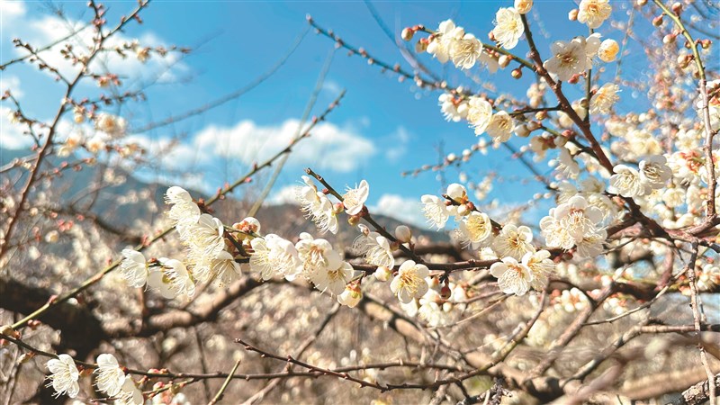 時序入冬,南投山區氣溫溜滑梯,且因夾帶水氣,國姓鄉九份二山梅花綻放,花開達8成,至元月中旬都是最佳觀賞期;信義鄉外坪頂、烏松崙、風櫃斗、牛稠坑等梅區陸續盛開,整體花況約4、5成,且因後續還有冷空氣,可望花開更盛,預計可維持到元月下旬,想要欣賞冬季限定「梅」景務必把握時間。圖/信義鄉農會提供