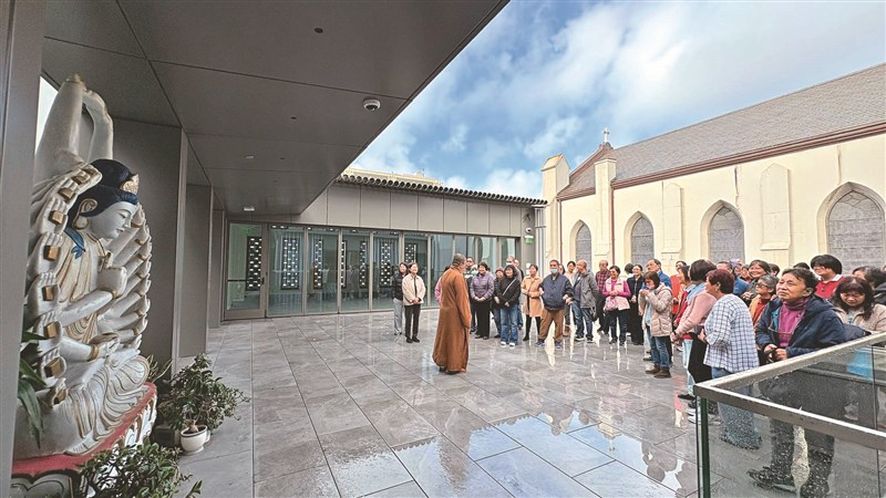 住持如揚法師(前排中)向護法信徒導覽新道場,並說明星雲大師為三寶寺所規畫的使用藍圖。
