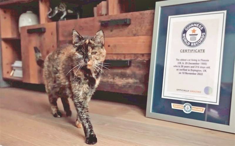【本報綜合外電報導】家貓的平均壽命約落在13至20歲,但英國有隻短毛玳瑁貓「佛洛西」(Flossie)卻打破常理,上月29日已高齡30歲,若換算成人類年齡,等同約120歲,寫下「全球現存最長壽貓咪」紀錄。