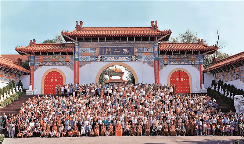星雲大師稱出家弟子俗家的父母為「親家」,兩年舉辦一次「佛光親屬會」交流聯誼。圖為2001年8月,大師與參加佛光親屬會的弟子及佛門親家於佛光山不二門前合影。圖/佛光山提供