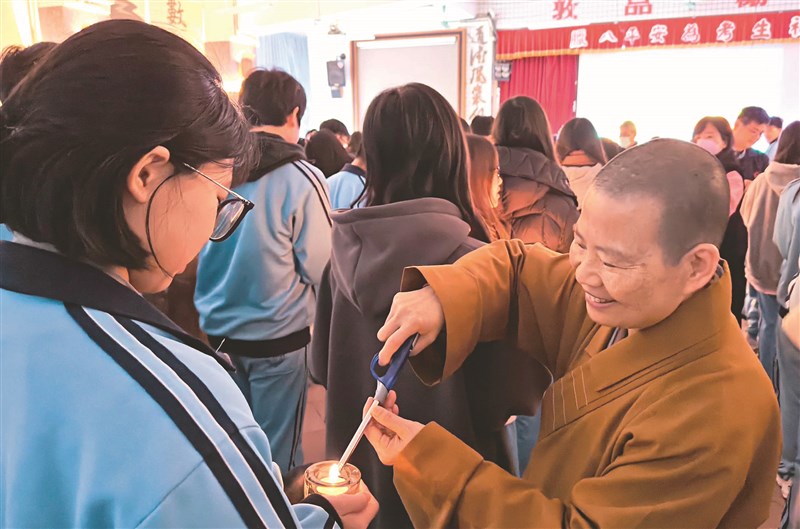 佛光山普門寺住持滿方法師(右)為格致中學學生點燈,祝福考生金榜題名。圖/人間社記者廖月霞