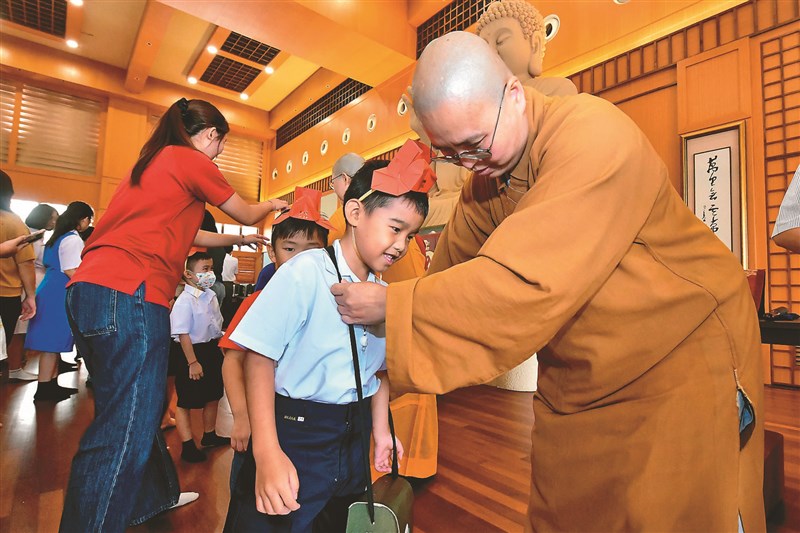 如彬法師(右)為佛光兒童送上佛光書包,準備入學就緒。圖/人間社記者胡柏瑜
