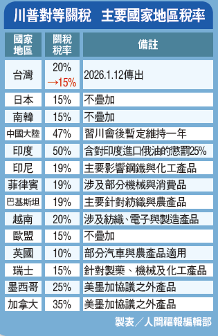 台美關稅 可望降至15% |2026.01.14 語音朗讀 29觀看次 字級 大 中 小 美國將與台灣達成貿易協議,輸美關稅擬從20%降至15%,與日、韓一致。圖為美國洛杉磯港長青碼頭堆放的長榮貨櫃。圖/美聯社川普對等關稅 主要國家地區稅率 製表/人間福報編輯部川普(中)與台積電董事長魏哲家(右),去年3月3日於白宮羅斯福廳會面。圖/美聯社 【本報綜合外電報導】《紐約時報》12日報導,3名知情人士透露,美國川普政府即將敲定與台灣的貿易協議,可能在本月宣布,協議將台灣輸美商品關稅從20%調降至15%,和去年與美國達成協議的日本和南韓稅率一致;作為協議的一部分,台積電將承諾大幅增加投資,在亞利桑那州再蓋至少5座半導體工廠。對此,美國貿易代表辦公室、商務部和台積電皆無評論。不過,美國最高法院計畫於美東時間14日早上10時(台灣時間14日晚間11時)將發布判決意見,而這起於去年11月進行辯論的關稅案,有可能列入當天宣判的案件之一。在言詞辯論過程,多名大法官對川普動用緊急權力課徵關稅的做法深表懷疑。關稅判決 川普:敗訴美就完蛋川普12日在社群平台發文表示,最高法院若判決他的關稅經濟政策違法,美國政府將不得不退還各家公司數千億美元,還不包括各國和企業為了避開關稅而進行投資,可能要求的「償付」金額,要是把這些投資也算進去可是數兆美元,情況將一團亂,美國幾乎不可能賠得起,「判我輸,美國就完蛋!」紐時報導,這項已談判數月的台美協議正在進行法律審查,有望在本月公布。知情人士表示,作為協議的一部分,台積電將承諾在亞利桑那州新建至少5座半導體工廠,投資時間表尚不清楚。自去年4月宣布加徵關稅以來,川普政府一直通過談判來降低稅率,以換取投資承諾,並達成符合美國國安優先事項的交易。南韓和日本已承諾在美國的造船、核能、電子以及關鍵礦產領域投資數千億美元。2020年以來,台積電已在亞利桑那州建成一座工廠,第二座正在建設中,計畫於2028年投產。台積電此前已承諾未來再建4座,但作為台美貿易談判的一部分,該公司同意至少再增加5座。台積電因正處於法說會緘默期,不回應外界傳聞,一切以公司對布公布資訊為準。但消息人士透露,受惠AI人工智慧和高效能運算由雲端向邊緣遍地開花,台積電3奈米製程接單大舉湧進,為滿足客戶要求,台積電產能規畫也被迫緊急大調整。半導體產業專家表示,若未來在美國增建的5座投資以晶圓廠為主,則意味台積電將從以台灣為核心的全球代工廠,過渡為台美雙核心運作架構。未來若以配合AI時代設施為主,不僅是技術轉移,也是半導體最精銳產能往美國移動,後續將影響全球半導版圖分配。台美關稅協議即將拍板,行政院經貿談判辦公室指出,雙方對相關課題已有大致共識,正在商議總結會議的時程,確認後將對外說明,會議後也會宣布協議的主要內容。總結會議在即 工具機業料受惠經貿辦表示,待台美進行總結會議後,雙方將會對外宣布協議主要內容,政府也將向國會與社會完整說明談判及協議內容,並依法定程序將完整協議文本及影響評估送交國會審議。國民黨立委賴士葆說,若確定美國對台關稅是15%,且無疊加,當然是談判成功,但台積電要赴美國蓋5座晶圓廠,如進一步將台灣最核心的護國神山搬到美國去,看起來買賣並不划算。另有中部工具機業者指出,若果真如此,對機械與工具機業者是項好消息,可拉近與日韓競爭者的起跑線;新台幣匯率若能穩定維持在31.6元,工具機業可望復甦。 前一篇文章 終結798天冠軍荒 林昀儒WTT多哈賽封王 下一篇文章 蘋果攜手谷歌AI Siri將導入Gemini 熱門新聞 01記得與忘記2026.01.0802悍將、雄鷹補戰力 拚闖季後賽2026.01.0903運動後分泌的肌肉激素是萬能荷爾蒙2026.01.1004台水潮州營運所落成 佛光山灑淨2026.01.0905全球最長壽貓 30歲等同120歲人瑞2026.01.0806社論--老宅延壽與老屋安住2026.01.1007南二監佛堂落成 佛光山灑淨祈福2026.01.1008常吃南瓜花椰菜藍莓 可緩解眼睛疲勞乾澀2026.01.0809澳洲野火延燒 吞噬30萬公頃叢林2026.01.1210【生活快門】女王的書店2026.01.12 訂閱電子報 台北市 天氣預報 台灣一週天氣預報 相關報導 終結798天冠軍荒 林昀儒WTT多哈賽封王示威潮蔓延 伊朗政權恐垮台伊朗鎮壓示威逾百死 川普:美準備伸援森林之巢 旅客住進樹梢川普不願中俄當鄰居 促油企投資委國3.2兆雕塑家攜手社區 共護大自然