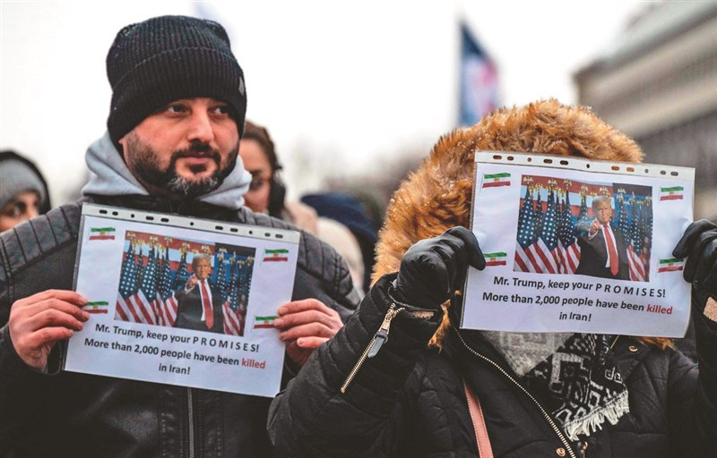 德國柏林12日爆發反伊朗抗議活動,示威群眾手持標語要求美國總統川普介入伊朗。圖/法新社