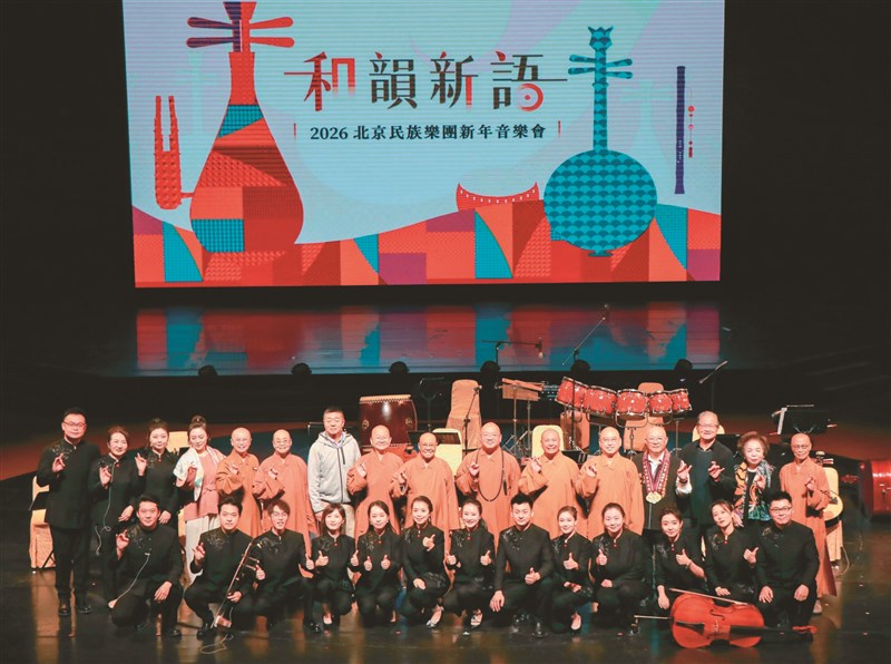 「和韻新語──2026北京民族樂團新年音樂會」10、11日在佛館演出圓滿,圖為心保和尚(後排右7)、慈容法師(後排右8)、慧傳法師(後排右6)、慧倫法師(後排右5)和如常法師(後排左8)與團員合影。圖/佛光山佛陀紀念館提供