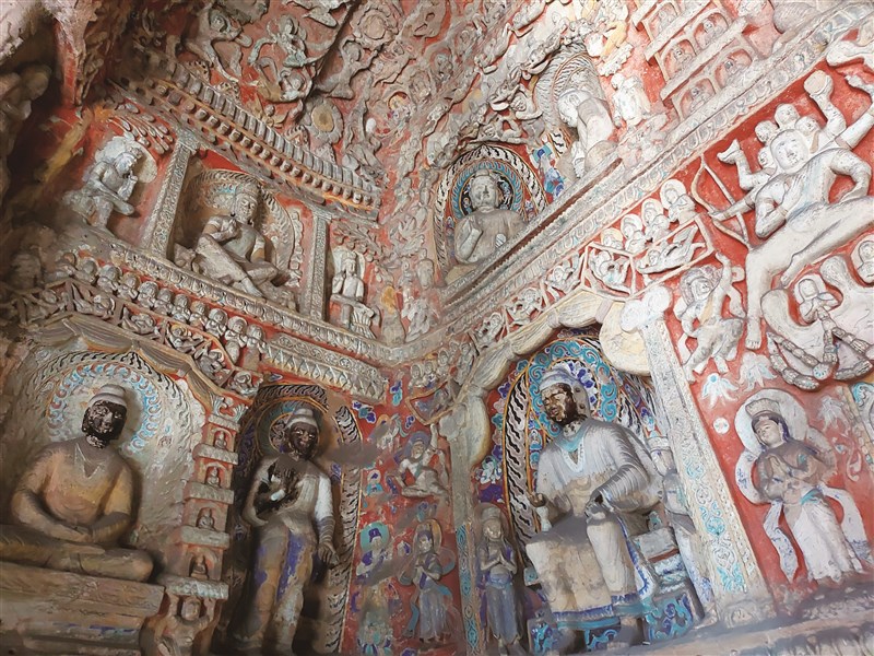 大窟中,大小佛像交錯,規規整整地從底至上,不論是佛教故事,或是飛天伎樂,緊密的,幾乎無一處留白。走進洞窟,呈現在眼前的是目不暇給的豐富,是完全無法細看的多樣。