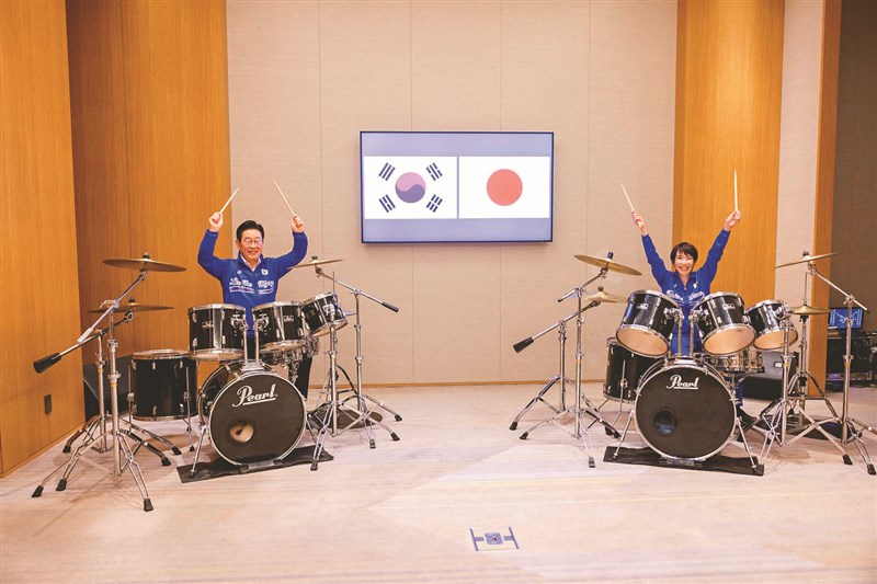 高市早苗(右)首度對外表態,有意於23日解散眾議院,並規畫2月8日進行投開票。圖為高市13日接待南韓總統李在明(左),兩人在領袖會談後即興同台打鼓。圖/法新社