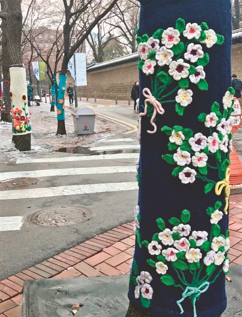 根據韓網報導,在落葉後略顯冷清的街景中,一件件針織作品宛如迷你時裝秀,為城市注入溫度與色彩,除了美觀之外,這些針織包覆其實也兼具實用功能。