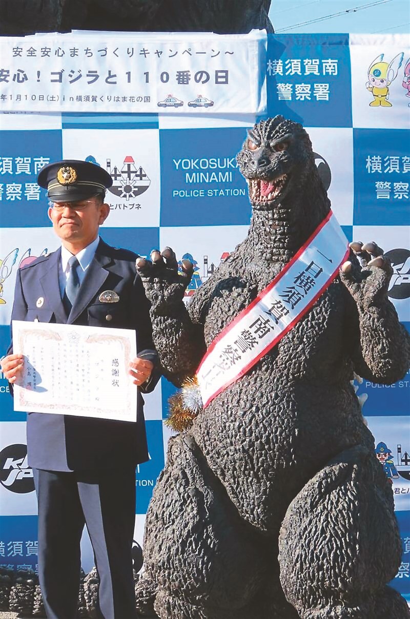 【本報綜合外電報導】怪獸哥吉拉登陸日本!神奈川縣横須賀南警察署日前舉行活動,邀請哥吉拉擔任「一日警察署長」,這主要是為了宣傳「一一○日」,教導民眾該如何正確使用報案電話。