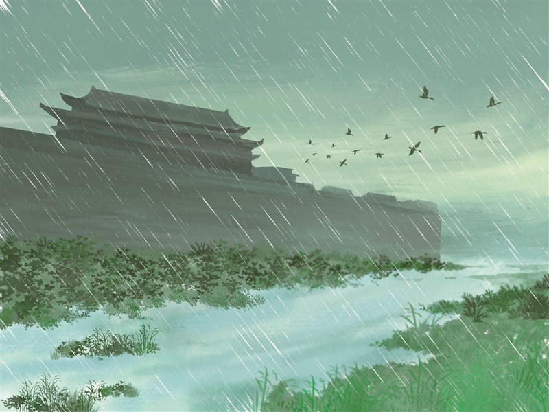 首句「江雨霏霏江草齊」,詩人以迷濛的細雨起筆。「霏霏」二字形容細雨連綿,彷彿為這座古城罩上一層輕紗,帶出憂鬱而朦朧的氛圍。而「江草齊」則描繪春草繁茂,與江面齊平。儘管土地依舊肥沃、草木欣欣向榮,但在這片繁花綠意之下,卻掩藏著歷史的殘跡,暗示自然界雖然生機如常,人世間卻已滄海桑田。
