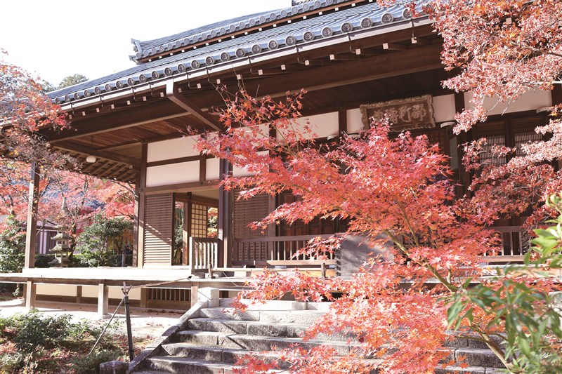 庭院側邊有一大片竹林,園林相映,幽僻清寂襯顯出楓的脫俗,從木堂沿著參拜路線前進,自青綠步道另一頭沿著石階登往最高處,可俯瞰鄰近街景。藍天當中有灰雲集聚,沉靜屋簷底下川流萬象人生,最頂上那棵楓承接陽光最多也最紅豔。稍作休息後繼續往上走,可抵桃山時代重要的建築文化財──多寶塔,塔高約十二公尺,據說是由京都市民捐贈,裡面供奉著釋迦牟尼、多寶二佛,因此也被稱為並尊閣。