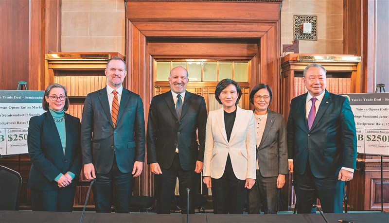 台美關稅談判在美東時間15日結束總結會議,雙方達成包括:台灣對等關稅調降為15%且不疊加,以及半導體及半導體衍生品等232關稅取得最優惠待遇等。圖左起為美國在台協會(AIT)執行理事藍鶯、美國貿易代表署代表葛里爾、美國商務部長盧特尼克、行政院副院長鄭麗君、經貿辦總談判代表楊珍妮、駐美代表處代表俞大㵢。圖/取自盧特尼克X