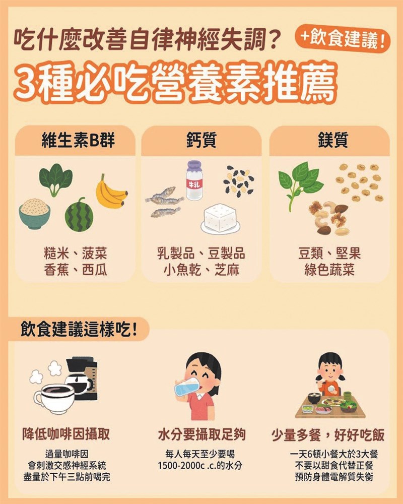 營養師解析自律神經失調 李婉萍:吃對營養調回身體平衡感 文/記者陳玲芳 |2026.01.17 語音朗讀 68觀看次 字級 大 中 小 營養師李婉萍建議,預防自律神經失調應補充三大關鍵營養素:維生素B群、鈣質與鎂。圖/李婉萍營養師提供營養師李婉萍建議,預防自律神經失調應補充三大關鍵營養素:維生素B群、鈣質與鎂。圖/李婉萍營養師提供「自律神經的修復,需要多面向介入。」李婉萍建議,腹式呼吸與冥想能放慢呼吸頻率,啟動副交感神經。圖/李婉萍營養師提供當長期作息失序、壓力過高,如同「蹺蹺板」般維持動態平衡的交感神經和副交感神經便容易失衡,進而出現多系統不適。(示意圖)圖/Pexels 文/記者陳玲芳自律神經失調不是突然發生,而是長期壓力、睡眠不足與生活節奏失衡的累積結果。當身體不斷發出失眠、心悸、腸胃不適或情緒起伏等訊號,代表神經調節系統已經超載。與其急著找藥,不如從飲食、呼吸、運動與休息同步調整,讓交感與副交感神經重新找回平衡,身體自然會慢慢回到穩定狀態。在門診與日常諮詢中,愈來愈多人形容自己「說不上哪裡不舒服,卻全身都不對勁」。睡眠品質下降、心悸、腸胃忽好忽壞,甚至情緒低落、焦慮反覆出現,但檢查結果卻往往顯示一切正常。李婉萍營養師指出,這類難以歸類的身體不適,常與「自律神經失調」有關,並非單一疾病,而是身體長期承受壓力後的整體失衡表現。自律神經系統由交感神經與副交感神經共同組成,負責調控呼吸、心跳、消化、體溫、荷爾蒙分泌等自動運作功能。理想狀態下,白天清醒與應付壓力時由交感神經主導,夜晚休息與修復則交由副交感神經接手,兩者如同「蹺蹺板」般動態平衡。當長期作息失序、壓力過高,這套調節機制便容易失衡,進而出現多系統不適。6大常見症狀與好發族群自律神經失調的症狀多元且變化大,可常見六大症狀。第一是睡眠障礙,包括失眠、淺眠、多夢與易醒;第二為心悸、心跳過快、頭暈或呼吸不順;第三是腸胃功能紊亂,如腹脹、腹瀉、便祕、噁心。第四為體溫與食欲異常,出現莫名流汗或食欲忽大忽小;第五為神經性疼痛,如頭痛、耳鳴與全身痠痛;第六則是情緒起伏劇烈,容易焦慮、緊繃或低落。這些症狀往往交錯出現,也因此常被誤以為只是暫時疲勞。從實務觀察來看,自律神經失調好發於二十至四十歲女性,與荷爾蒙波動密切相關,包含生理期前後、產後或更年期過渡階段。此外,長期熬夜、睡眠不足與高壓過勞的上班族,也常在壓力累積後出現失衡。另一群高風險者則是「高內耗型人格」,如完美主義、責任感過重、習慣壓抑情緒者,長期處於心理警戒狀態,更容易耗損神經調節能力。若本身患有糖尿病、自體免疫疾病、類風溼性關節炎等慢性病,神經系統需長期應對身體發炎與代謝壓力,自律神經失調的風險也隨之升高。此外,部分心臟用藥或抗憂鬱藥物,可能影響神經傳導功能,若服藥期間出現明顯不適,應與醫師討論調整,而非自行停藥。(參考左圖)吃對與進食節奏一樣重要在飲食調整上,營養師李婉萍建議以「穩定神經、避免刺激」為核心原則。維生素B群可由糙米、菠菜、香蕉等植物性食材補充,協助神經正常運作與情緒穩定;鈣質可從豆製品、芝麻與深綠色蔬菜攝取,有助肌肉放鬆與心跳調節;鎂質則存在於豆類、堅果與綠色蔬菜中,被視為天然的神經安定營養素,對於睡眠與心律穩定皆有助益。除了營養素本身,飲食節奏同樣關鍵。李婉萍指出,過量咖啡因會刺激交感神經,使心跳加快、焦慮感上升,建議含咖啡因飲品於下午三點前飲用。水分不足可能影響血壓與神經傳導,每日應依體重與流汗狀況補充足夠水分。李婉萍也提醒,少量多餐、細嚼慢嚥,避免以甜食取代正餐,有助維持血糖與電解質穩定,減少神經波動。不少患者最挫折的經驗,是反覆檢查卻找不到異常。李婉萍營養師指出,自律神經屬於功能性調控系統,負責的是「節奏與平衡」,並非單一器官結構,因此不易在常規檢查中呈現數值異常。她表示,這正是身體在提醒「負荷已超過修復能力」,若只著眼於報告,忽略生活型態與壓力來源,失衡狀況往往會持續存在。多面向介入與學習紓壓「自律神經的修復,需要多面向介入。」李婉萍建議,腹式呼吸與冥想能放慢呼吸頻率,啟動副交感神經。芳療嗅聞柑橘或木質調香氣,有助降低緊繃感;溫水澡能放鬆肌肉、促進入睡;而規律的輕量運動,如快走、瑜伽、太極,則可同步改善心肺功能與情緒穩定。她也強調,重點不在強度,而在持續性。李婉萍營養師也以自身經驗分享,當壓力過載時,刻意「離開現場」非常重要。她會選擇無目的散步、讓身體感到適度疲累,或透過看電影、觀劇(非「追劇」)釋放情緒,都是讓神經暫時卸下警戒的方式。自律神經的調整,是一項長期工程,當生活節奏變得可預期、可掌控,身體自然也會以更穩定的睡眠、情緒與能量狀態,回饋你所投注的耐心。 前一篇文章 【聊聊心裡事】 三次免費諮商,怎麼用最有幫助? 下一篇文章 【養眼專欄】 熱敷眼罩只有改善眼睛乾澀疲勞嗎? 熱門新聞 01瑕疵品反爆紅 哭哭馬賣到缺貨2026.01.1402台南林鳳營 落羽松花海2026.01.1303搶白金會員 男子12小時搭6次飛機2026.01.1304台南黃金海岸 台版邁阿密2026.01.1105靜電從哪來?2026.01.1206星雲大師全集⑳【佛教管理學②】佛教的「梵唄音樂」管理學⑥2026.01.1107日
