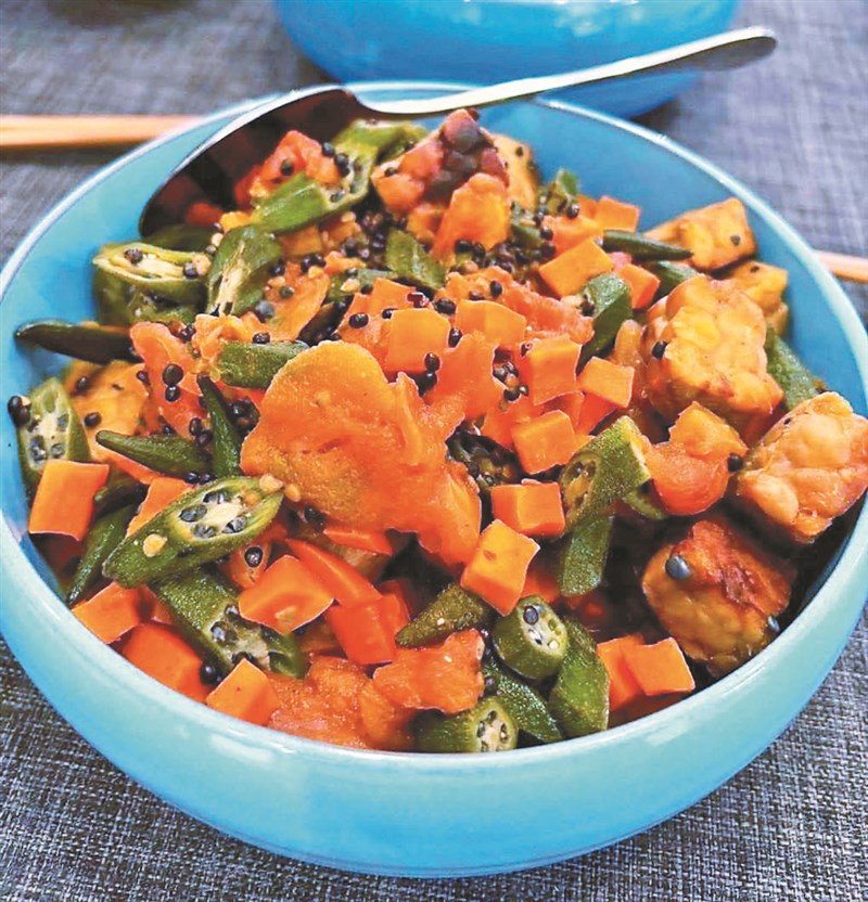秋葵、番茄、鷹嘴豆天貝、紅蘿蔔