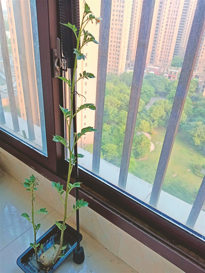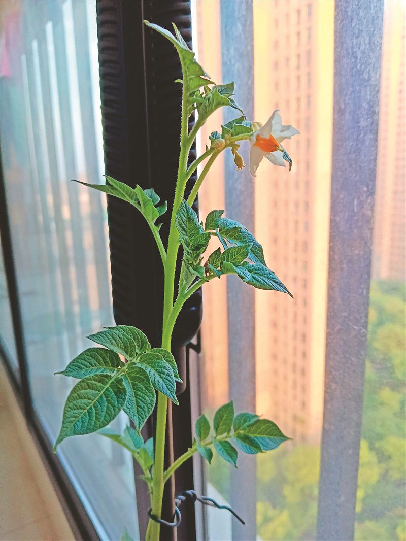 上網查到水培馬鈴薯能開花的資料,原本我放蔬菜的塑膠盒便有了新的使命。我將清水沒過馬鈴薯底部三分之一,一日日過去,馬鈴薯的根鬚在透明容器裡舒展成白色的珊瑚,起初只是羞怯的絨毛,漸漸變得堅韌有力。