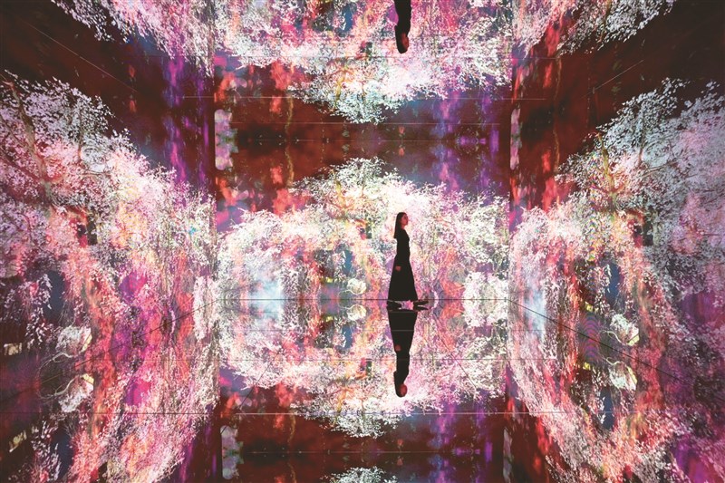 「光之細語,色彩之夢」是由兩千條水晶串飾構成閃耀奪目的夢幻空間。一踏入「深淵彼岸的夢」展區,便被盛開的花朵包圍,再走進由鏡面與巨型螢幕構成的七百二十度度全景空間,櫻花、煙火、蔚藍海洋不斷變化,讓觀眾彷彿沉浸在前所未見的彼岸世界。