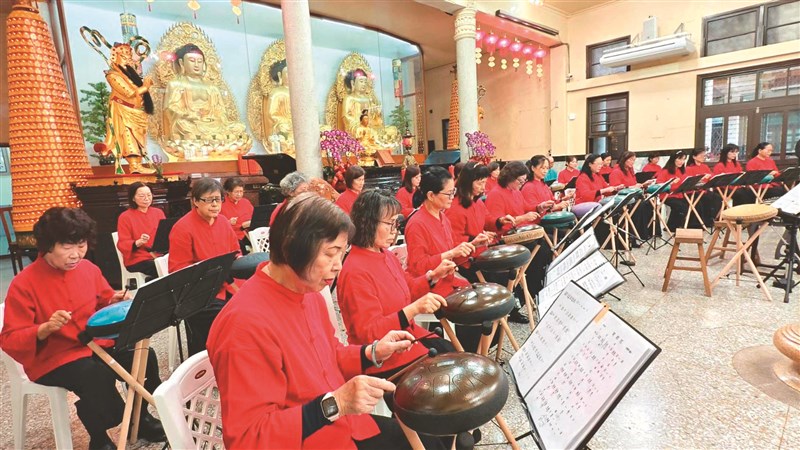佛光山竹東大覺寺17日舉辦「空靈天鼓音樂分享會」,由音樂家林意君老師指導,吸引佛光會員及竹東鎮民逾百人前來感受空靈音律。長期致力於音樂與文化藝術推廣的竹東鎮鎮長郭遠彰蒞臨,高度肯定此活動,同時親自用空靈天鼓演奏第一首曲子。圖為空靈天鼓演奏現場。圖/人間社記者陶文榮
