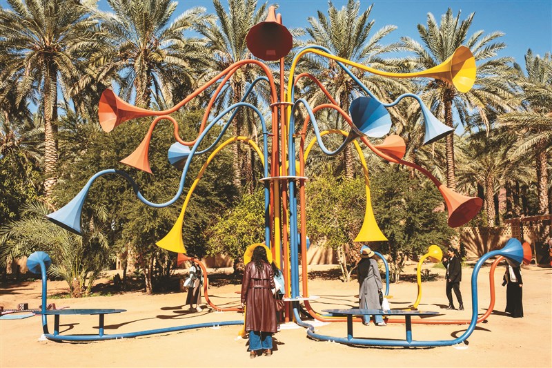 阿魯拉位於沙烏地阿拉伯西北部,完美融和綠洲山谷、砂岩山脈及考古遺跡,是世界級的歷史文化與旅遊勝地,最近當地正舉辦第4屆國際露天雙年展,藝術家們以各種雕塑與裝置作品,與阿魯拉令人驚嘆的自然景觀及歷史遺產,展開深刻對話。圖為16日遊客造訪其中一件裝置藝術。圖/新華社
